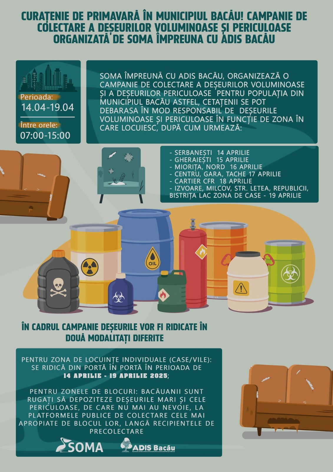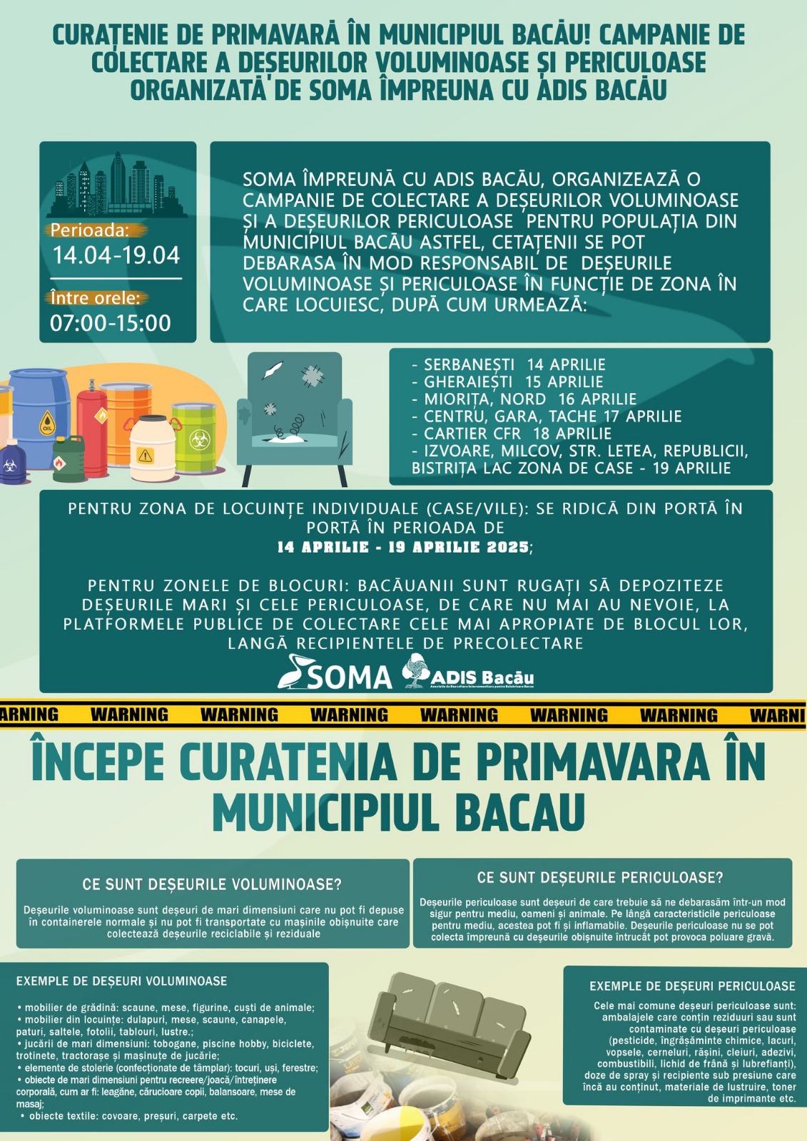 În perioada 14 – 19 aprilie, ADIS Bacău împreună cu SOMA organizează o campanie de colectare a deșeurilor voluminoase și a deșeurilor periculoase din deșeuri menajere pentru populația din municipiul Bacău.